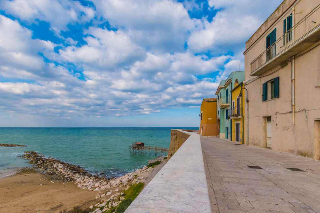 Diese schmale Gasse verläuft entlang des Randes der Altstadt. Von dort oben scheint die Welt stillzustehen. Sie sehen die blaue Kurve des Golfs von Vasto, die weitläufige Strandlinie von Rio Vivo, und – wenn der Himmel klar ist – die Tremiti‑Inseln wie Geister am Horizont.